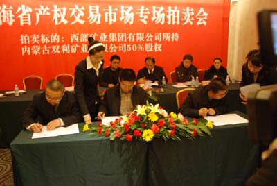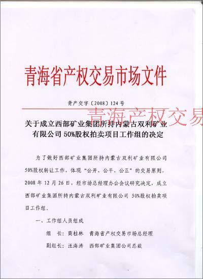2008年12月27日,青海省产权交易市场对我省迄今为止最大的一笔股权转让项目——西部矿业集团有限公司所持内蒙古双利矿业有限公司50%股权进行了专场公开拍卖。竞买双方经过44轮的激烈竞价,最终6号竞买方内蒙古巴彦淖尔西部铜业有限公司以4.35亿元的成交价成交,使国有资产实现了8695.015万元的增值,增值率达到24.98%。创造了我省国有资产拍卖增值的最高纪录。