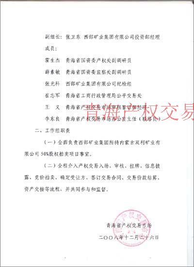 为确保此次股权转让活动的顺利实施,青交市场从受理委托开始,组织成立了由国资委、工商局、西矿集团、青交市场人员组成的项目工作组,全程介入该项目的入场、审核、挂牌、信息披露、竞价拍卖、确定受让方、签订交易合同、交易价款结算、资产交接等流程,并共同参与和监督项目的进展情况。于11月22日通过《青海日报》和青交市场网站向社会发布了挂牌公告。公告期间,网络点击率达到1098次,有数十家企业和竞买人打电话或上门咨询。青交市场根据《企业产权转让管理暂行办法》之规定,对转让方所持股权进行了严格审核,截止12月19 日,青交市场正式征得了江阴中基矿业投资有限公司(“江阴中基”)和巴彦淖尔西部铜业有限公司两家符合条件的意向受买方。本着审慎原则,青交市场选择较为权威、具有国家级资质条件的兰州国际拍卖有限责任公司承办此次拍卖活动,在该项目拍卖前,还在甘肃和青海两省商务厅、两省工商局履行了备案程序。