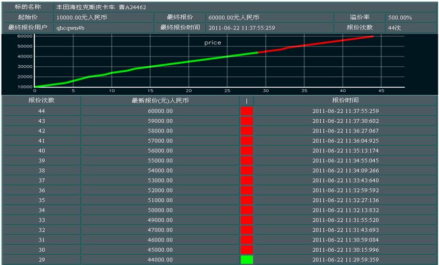 与现场拍卖火爆的气氛正好相反,在另一层同时进行的网络竞价现场,场面则稍显安静,这里更像证券交易所的交易大厅,众多竞买人通过各自的电脑终端,快速的将一串串数据指令注入车辆竞价交易系统中,众多互不谋面的参与者在网络空间“厮杀”的激烈程度丝毫不亚于现场拍卖,其中一辆车号为青A60361的三菱越野车在限时竞价时段网络报价呈现井喷状态,从青海车辆竞价系统的大屏幕看到,该辆车从15:19分到15:41分结束的20来分钟时段内,报价从3.4万元一路猛增到5.4万元,网络报价次数高达14次之多,竞争激烈可见一斑。这种不受时间、空间、地点、人数限制的“虚拟卖场”充分发挥了网络无限宽广、竞价不受限制的优势,为以后公开、公正的处置国有资产提供了一个非常有效的方式。