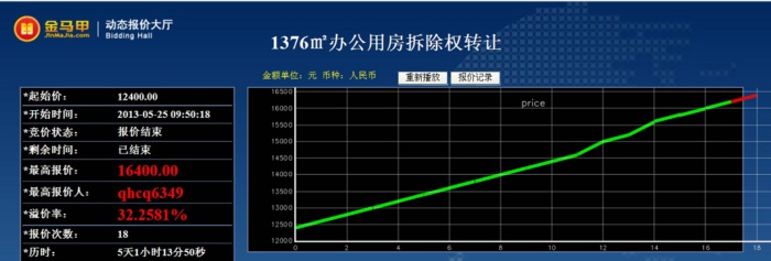 此次活动共有5位竞买人参加网络竞价,起拍价为12400.00元整,经过18次报价,最终以16400.00元整成交,项目增值率达32.00%。