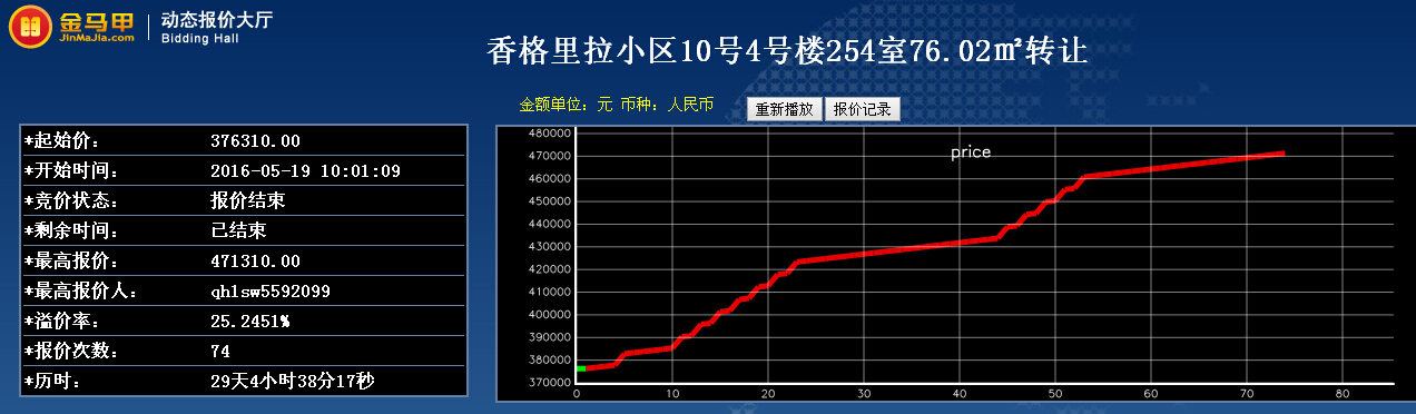 此次活动共有4位竞买人参加网络竞价,起拍价为37.631万元整,经过74次报价,最终以47.131万元整成交。