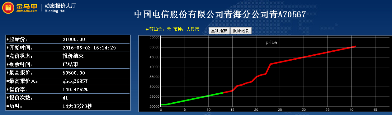 此次活动共有5位竞买人参加网络竞价,起拍价为2.1万元整,经过41次报价,最终以5.05万元整成交。